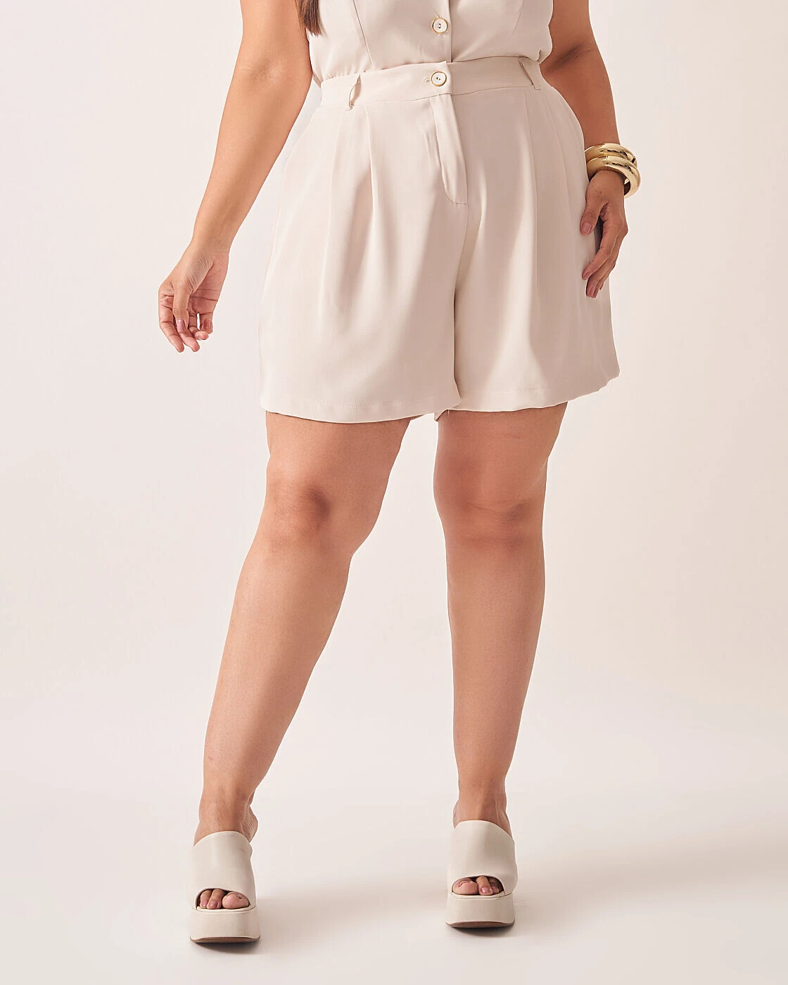 Bermuda em alfaiataria, com pregas frontais, bolso faca, botão com detalhe dourada na borda. Possui elástico cós costas,bolso fake de alfaiataria e possui forro, confeccionado em poliéster com elastano.