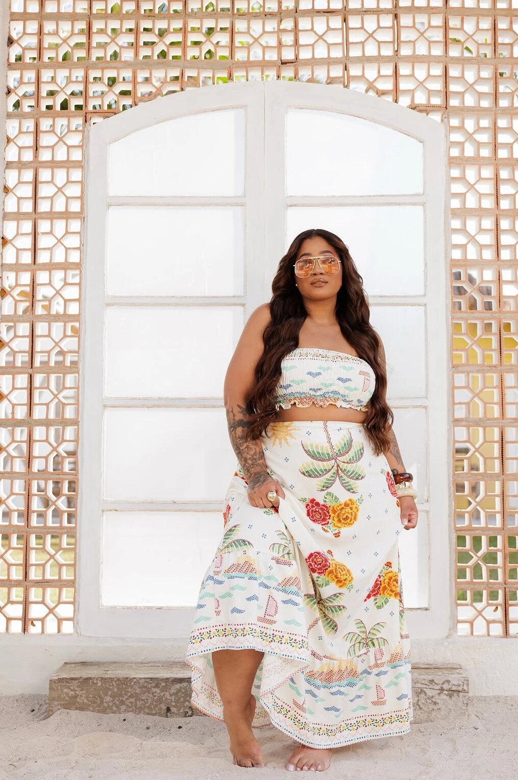 Saia e Top estilo Farm, em viscose , com estampa tropical. Top possi elastex 360graus.
