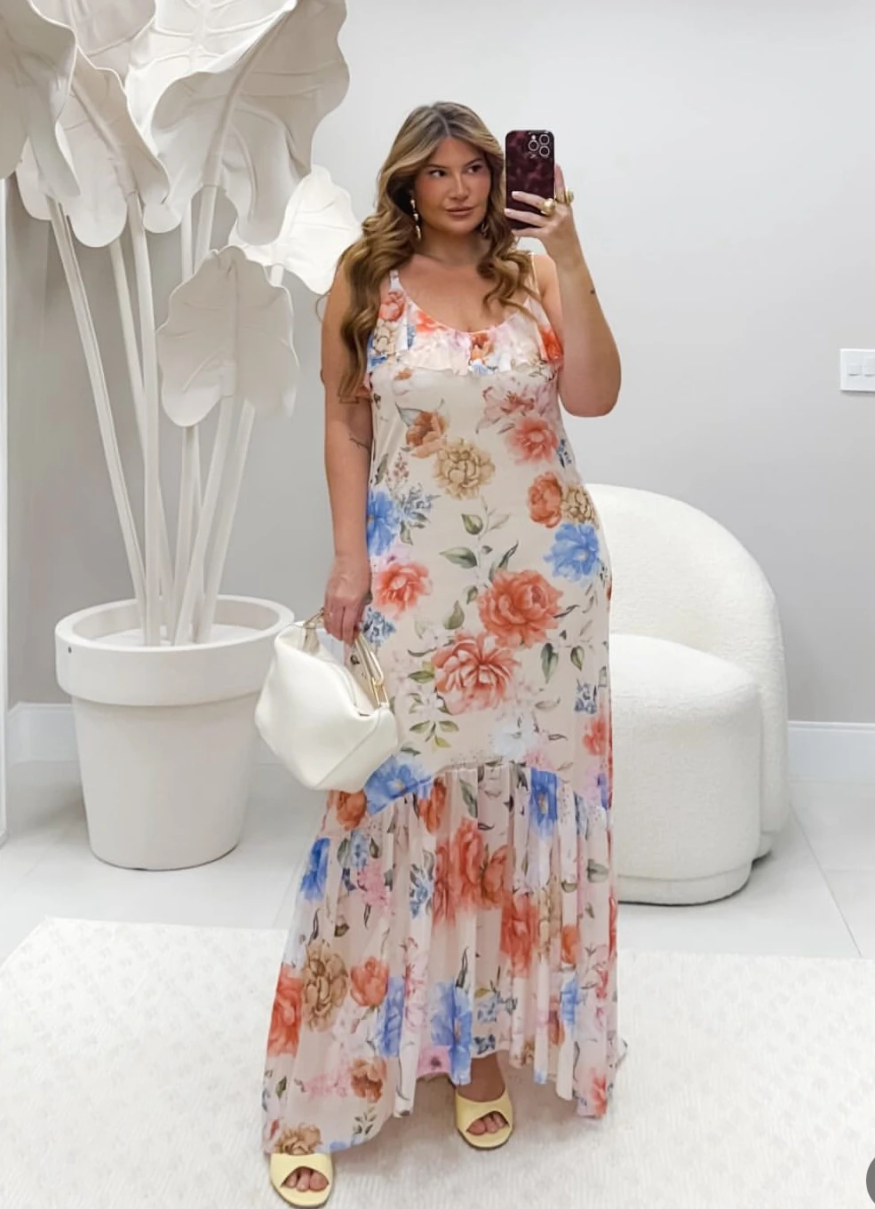 Vestido em tule floral com forro, delicado e romântico. Possui alças reguláveis, babados no decote e na saia que trazem leveza e movimento. Ideal para ocasiões especiais, combina conforto e estilo em uma peça única.